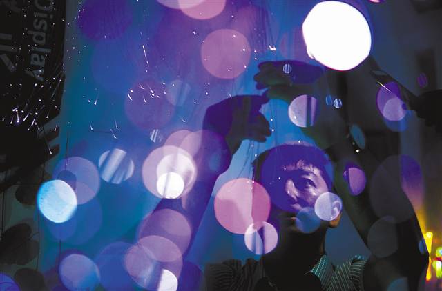 江北區港城工業園重慶光遙光電科技有限公司,工作人員正調試“光纖垂簾”。