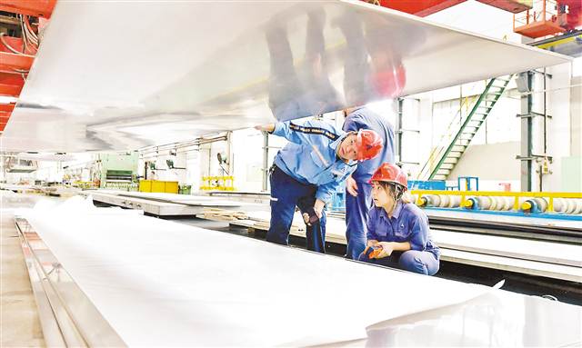 西南鋁工作人員在生產線上檢查即將出口烏克蘭的鋁材產品。