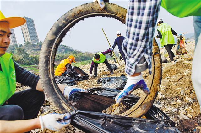 下午,大渡口古鎮江邊,數百名身著綠色背心的志愿者正在清撿長江岸邊的一些廢舊塑料、泡沫垃圾等,他們有的除雜草、運垃圾,有的對江邊護堤樹木進行養護,現場一片忙碌?!懊康綕q水的時候,就會有一些廢舊垃圾沖到岸邊,特別是一些塑料、泡沫,對環境、江水有不小污染?!倍啻螀⒓印扒鍧嵞赣H河”行動的九宮廟街道志愿者李林樺告訴重慶日報記者,“長江是我們的‘母親河’,作為生活在這里的每一個人,都應該呵護‘母親河’。”