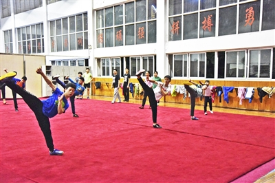 ????眾所周知,練習武術套路是一個長期過程,目前鐘宇洪一天的軌跡,大抵如此:周一到周五,早晨6時,起床,開始晨練,7點左右去37中上學;下午5點放學后就來到訓練館里進行基礎訓練,有時是2個小時,有時延長到2個半小時;然后是自修時間,10時熄燈睡覺。周六全天訓練,周日休息。