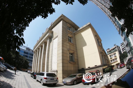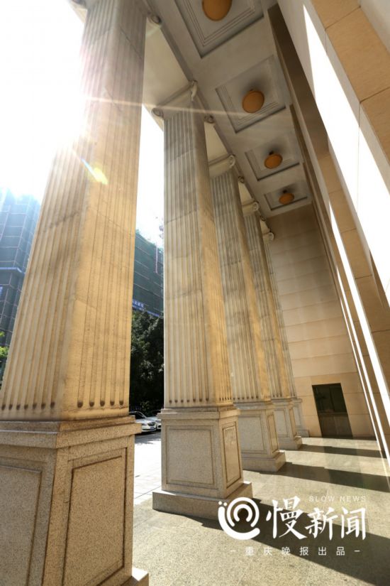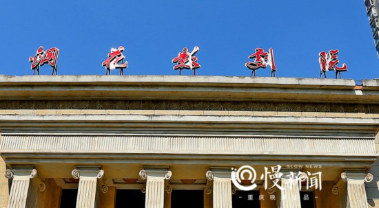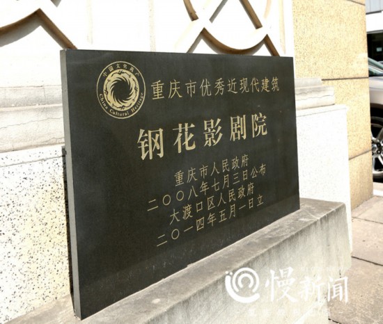 6根高達十余米的石質立柱,撐起整個影劇院大門,左右兩側,分別立著“重慶市優秀近現代建筑”、“重慶市優秀歷史建筑”的牌匾。棱角分明的頂上,紅色的“鋼花影劇院”五個大字顯得格外引人注目。