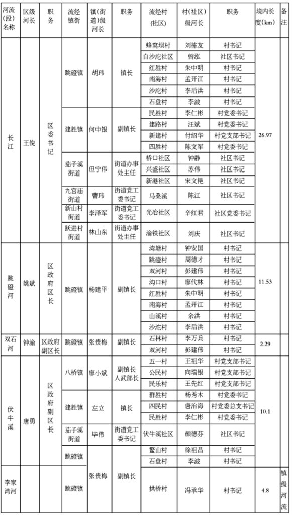 根據《中共重慶市委辦公廳、重慶市人民政府辦公廳〈關于進一步強化全市河長制組織體系〉的通知》(渝委辦〔2017〕134號),區委辦印發了《中共大渡口區委辦公室、大渡口區人民政府辦公室〈關于進一步強化全區河長制組織體系〉的通知》(大渡口委辦發〔2017〕29號),在全區實行區、鎮(街道)兩級“雙總河長”制。目前,區、鎮(街道)兩級河長均已調整到位。重慶市大渡口區河長辦公室重新編制了《大渡口區行政區域河長名單》、《大渡口區河流河長名單》、《大渡口區河流上的水庫庫長名單》,現公示如下: