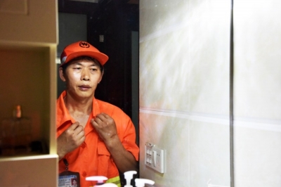 ????簡單的早飯過后,老余就要出門開始一天的環衛工作了。出門前,他總會在鏡子面前整理工作服,從帽子、衣領到袖章,一絲不茍。環衛工人沒有休息日,每天都要上班,老余兩口子每天一起出門,一起回家,工作雖然辛苦,但老余覺得,這也是一種小幸福。