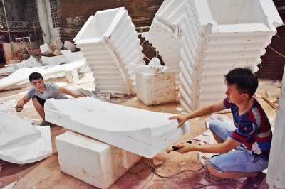 ????走進一扇斑駁古舊的深紅色大門,滿目盡然是一大片白色的石膏雕刻和已經成型的泡沫雕刻。機器轟隆隆的運轉著,年輕的藝術工作者們頂著暑熱,顧不上頭上肩上淌落的汗珠,聚精會神地在泡沫上測量數據……