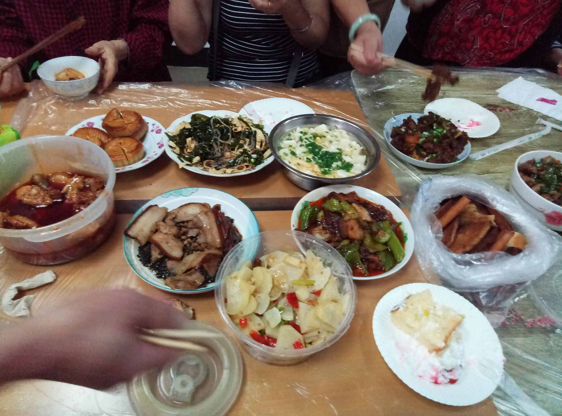 ????登記菜品,對(duì)菜品貼標(biāo)簽,安排壽星們就坐,今天上午11點(diǎn),活動(dòng)現(xiàn)場(chǎng)志愿者們一直忙碌著。左鄰右舍的43位“老壽星”們圍在一起,家長(zhǎng)里短的擺起了龍門陣,介紹自己做的拿手菜品,還相互學(xué)習(xí)做菜技巧,看到餐桌上擺滿了粉蒸肉、燒白、尖椒雞、小火鍋、蘑菇紅燒肉等50余道香滿四溢的家常菜,邊拉家常邊品嘗美食的壽星們,在場(chǎng)的每一位人臉上都洋溢著幸福的笑容。