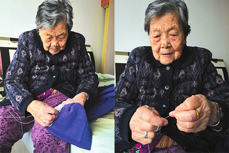 ????趙澄英告訴記者,家里的菜都是母親搶著做,還有洗衣服、洗襪子這些活兒,母親都做得很順溜。“母親一生喜歡縫補,百歲以后,她還是經常‘沒事找事’地找些零頭活干。她剪袖接領,然后穿針引線,縫縫補補。她或自己手工加工棉褲,或將棉襖改成單衣。”