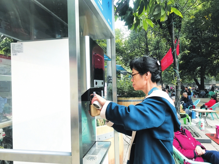 ????11月9日下午,家住國瑞城小區的王娟阿姨和姐妹們約好去心湖公園玩。來到公園門口,她從挎包里掏出保溫杯,在一個像電話亭的藍色小屋前,熟練地對著亭子里的機器一按,一股熱水流了出來,幾秒鐘就盛滿了杯子。“最近天氣降溫,出來逛公園的時候有杯熱水喝是件很開心的事。”王娟滿意地對同伴說。