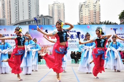????此次片區聯動展演共分為“規定舞蹈”“自選舞蹈”“優勝PK”三個環節進行。26支參演隊伍首先表演“規定舞蹈”——《太陽出來紅滿天》。在“自選舞蹈”環節,我區跳磴鎮藍沁舞蹈隊帶來的《阿西里西》,茄子溪街道心怡舞蹈隊帶來的《梨花情》,新山村街道、躍進村街道九九藝社、好時光藝術團帶來的《社區梨園春》等節目逐一精彩亮相,各參賽隊伍的表演各有千秋,精彩紛呈。