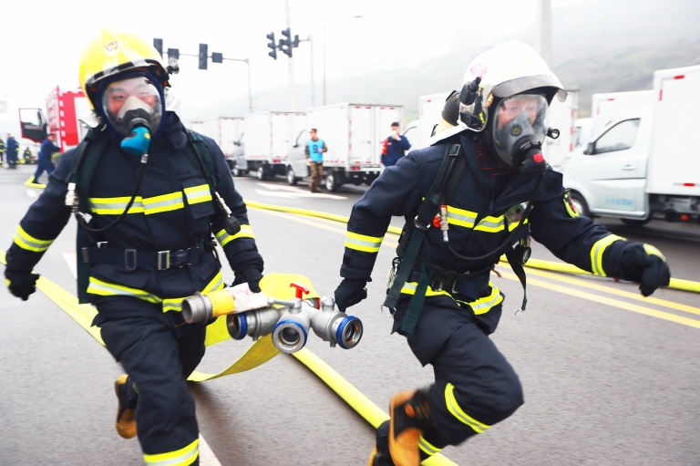 ????據悉,此次比賽共設7個科目:背負空氣呼吸器5000米跑、400米疏散物資救人、100米負重跑、繩索攀爬操、搬運重物折返跑、初戰快速出水控火操、槍炮協同滅火操。(區消防支隊)