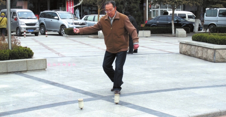 區(qū)府廣場上,一群晨練的居民用鞭子抽打陀螺的啪啪聲和陀螺旋轉時的嗡嗡聲,吸引了許多路人“粉絲”的圍觀。陀螺在清晨的陽光下“翩翩起舞”,這種懷舊的游戲已然成為了休閑健身的一道亮麗風景線。