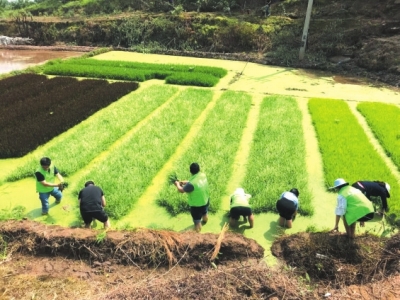 ????經過三個小時的辛勤勞動,大家終于將各色秧苗插滿了“稻花香”項目的8畝田地,綠的、紫的、黃的、白的、紅的,甚是好看。