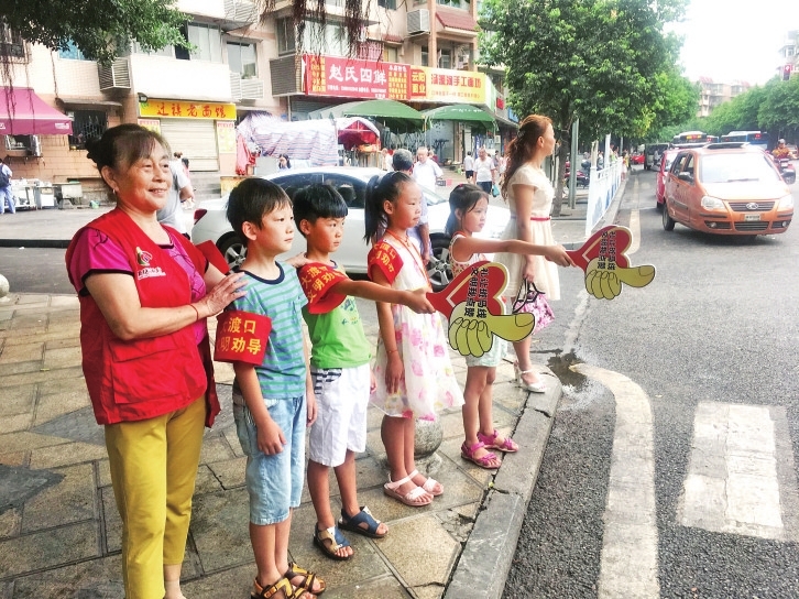 ????活動當天,志愿者和轄區小朋友身著醒目的服裝,手拿勸導標語牌,準時到達各個地點開展志愿行動。隨后,志愿者還協同10余名小小文明交通勸導員,在社區工作人員的陪伴下一起走上街頭,提醒人們不闖紅燈,遵守交通規則。