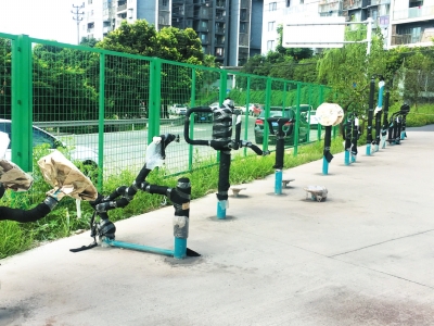 ????經(jīng)過(guò)兩天的施工和安裝,全套器材都安裝到位了。有一些器材需要灌填地基的水泥干了以后才能使用,社區(qū)工作人員貼了告示,拉起了隔離繩。