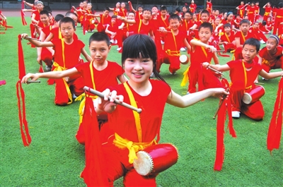 ????“腰鼓的打擊動作形式多樣,方式繁多,特別是那些動態行動中的表演式腰鼓,對于小學生來說,表演起來確實有一定難度,需要花費大量時間進行排練。”學校一位負責腰鼓的老師告訴記者,為了讓學生練好腰鼓,又不耽誤學習,學校編排了一套小學生“腰鼓特色”課間操,不僅增強了孩子們的體質,還傳承了民俗文化。