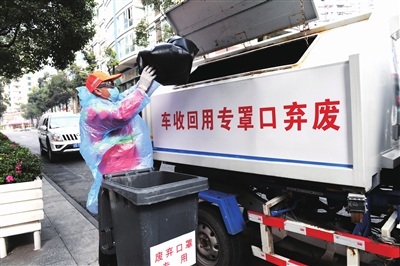 ????(記者 王玲美) 2月13日下午2點,戴好防護帽、護目鏡、口罩、手套,穿上制服、鞋套,拿上裝有84消毒液的噴霧器,大渡口區固廢運輸有限公司的收運工人李勇平和曹照春開著廢棄口罩專用回收車出發了。