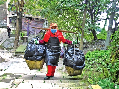????“我每天要走5段梯坎路,最遠(yuǎn)的一段梯坎路大概有1000米,每次兩筐垃圾的重量大概有150斤,一天要跑12次。每天晚上這樣的‘健身’量,讓我手臂上的肌肉好健碩。”吳志友打趣地說。
