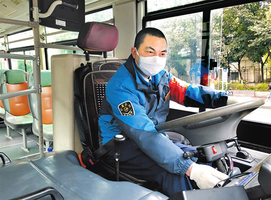 5點40分,楊乾勝來到自己車上,確認車輛一切正常后,開始做保潔工作。雖然每輛公交車出車前,都要進行清潔和消毒,但楊乾勝還是有些不放心,他把車上乘客容易觸碰到的扶手,用消毒液再次噴了一遍。一切準備妥當后,才精神抖擻坐上自己的駕駛位。