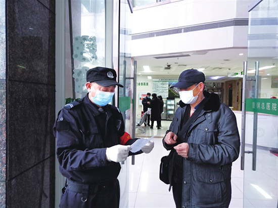 6:30,任華平為全院的白班安保人員統(tǒng)一測量體溫,對(duì)當(dāng)天的工作進(jìn)行安排。任華平說,由于疫情原因,他們每個(gè)人的工作量比之前增加了兩三倍。在一個(gè)多月的時(shí)間里,光是醫(yī)院入口的人員體溫日均檢測次數(shù)就超百次,高峰時(shí)可達(dá)近千人。