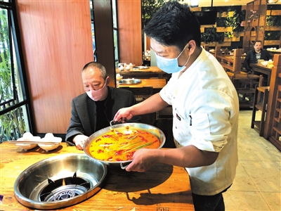 ????“這家火鍋店我以前三天兩頭就和老婆來吃,想念這個味啊!想了一個多月啦,今天終于又來吃到啦!”家住我區躍進村街道躍進村的甘志強,提前一天就預訂了當天來吃火鍋。