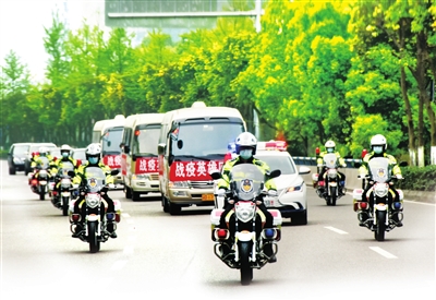 ????11點30分,載著我區第一批、第二批援助湖北醫療隊30名隊員的車隊,緩緩駛進新華立交。現場警車鳴響警笛,警察整齊列隊敬禮致意。在摩托騎警車隊和警車的護送下,大巴車緩緩駛入城區。