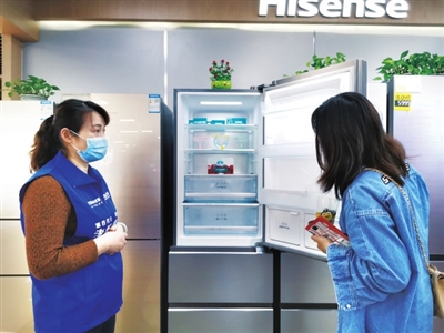 ????“我才搬了新家,想買個大一點的冰箱。”4月8日下午,春暉路街道錦城社區居民唐嬌倩來到蘇寧易購大渡口步行街店(以下簡稱蘇寧易購),在海信品牌導購員陶杏的陪同下選購家電。