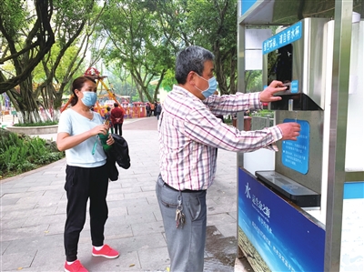 ????4月17日,記者在大渡口公園、九宮廟商圈步行街等地走訪時看到,不少市民正在使用公共直飲水機,每臺直飲水機上還貼有區城管局發布的《關于逐步恢復直飲水機運行的告示》,及時向市民朋友告知直飲水機恢復運行的情況。
