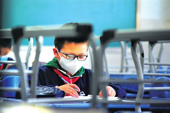 育才小學,一名四年級學生早早來到久別的教室,眼鏡片上的霧氣還未消散,就已進入了專注的學習狀態。