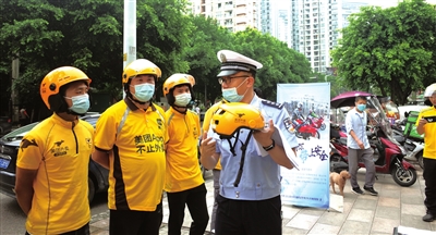 民警余可向記者介紹,夏季來臨溫度升高,騎手們在駕駛時佩戴頭盔難免會覺得悶熱。一部分騎手會因無法忍受高溫,出現不按要求佩戴頭盔出行的情況。開展宣傳活動就是向騎手們普及相關法規,勸導他們要嚴格遵守交規。