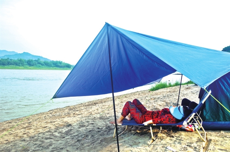 時(shí)值下午5點(diǎn)左右,沙灘上有不少小孩正在玩沙戲水,還有些人在江灘上擺造型拍照,江岸邊還搭有幾頂小帳篷,帳篷里有人正愜意地吹著輕柔的江風(fēng)在小憩……