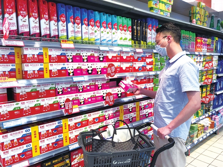 在另一家超市,不少標明了無毒無害的滅蚊產品被擺放在了貨架顯眼位置。“比起傳統的滅蚊、驅蚊方法,市民更青睞健康、環保型的驅蚊裝備,例如驅蚊液、電滅蚊拍等?!币晃皇圬泦T表示,現在很多家庭會選擇無色無煙無味的蚊香液代替舊式的盤式蚊香。