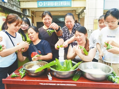 茄子溪街道興盛社區志愿者教居民包粽子 通訊員 楊佳 攝