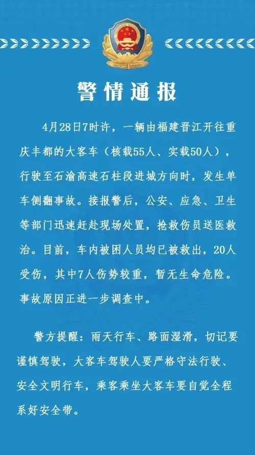 4月28日,一輛由福建晉江開往重慶豐都的大客車,在行駛至石渝高速石柱段進城方向時,發(fā)生單車側(cè)翻事故。接警后,公安、應(yīng)急、衛(wèi)生等部門迅速趕赴現(xiàn)場處置,搶救傷員送醫(yī)救治,并第一時間發(fā)布通報稱,此次交通事故造成20人受傷,其中7人傷勢較重,暫無生命危險,并提醒駕駛?cè)艘獓栏袷胤ㄐ旭偂踩拿餍熊嚕丝统俗罂蛙囈杂X全程系好安全帶。