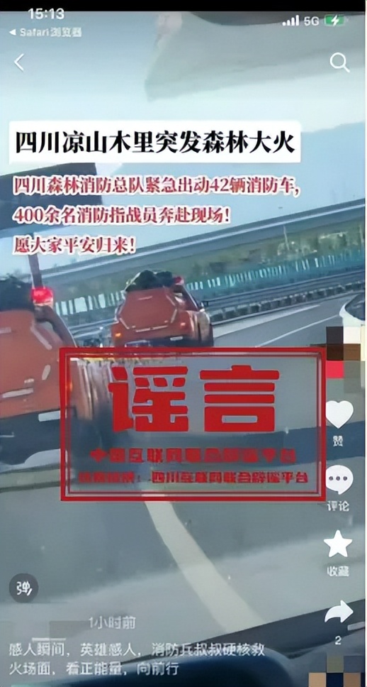 真相:近日,有網民在短視頻平臺上發布視頻,并配以“四川涼山木里突發森林大火,四川森林消防總隊緊急出動42輛消防車,400余名消防指戰員奔赴現場”的文字。當地網信部門聯動應急管理局進行查核,證實四川涼山木里近日未發生森林大火。(來源:四川互聯網舉報辟謠平臺)