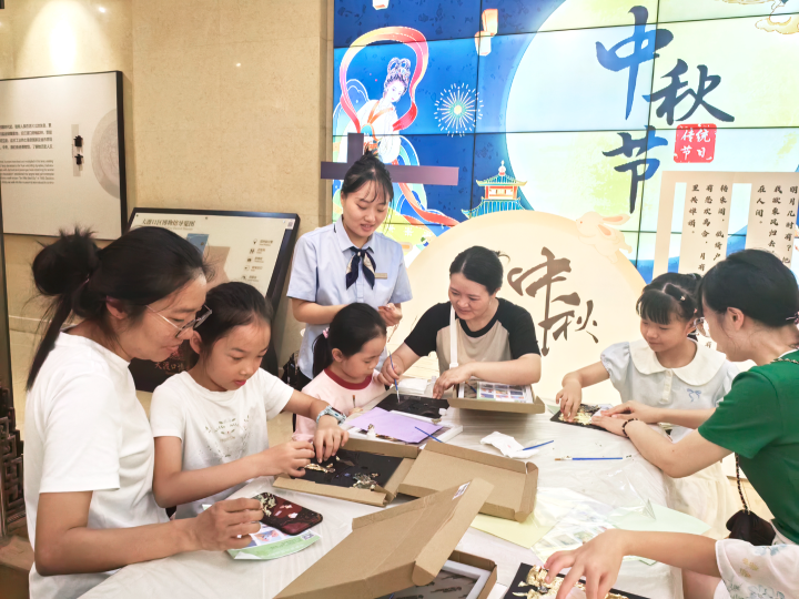 9月15日,區博物館開展“穿越古今 共賞明月”主題社教活動,孩子們和家長在工作人員指導下一起動手制作中秋金箔畫。