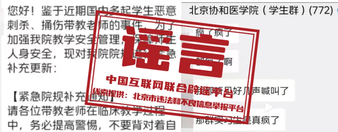 真相:近日,一張北京協和醫院(總院通知群)在群內發布的通知截圖在網絡上流傳,截圖顯示“為了加強我院教學安全管理”“請各位帶教老師在臨床教學過程中務必提高警惕”,通知落款為“北京協和醫院教學管理部門”,發布時間為2024年10月13日。相關發帖還顯示,上述通知與“該院學生刺傷老師”事件有關。對此,10月17日晚,北京協和醫院發布辟謠聲明稱,部分社交媒體和網絡平臺流傳關于“北京協和醫院學生刺傷帶教老師”的信息,經核查證實為虛假信息,已向公安機關報案。(來源:“北京網絡舉報”微信公眾號、@北京協和醫院)