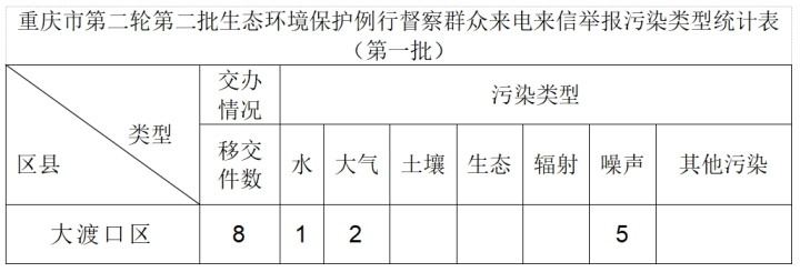 11月18日,重慶市第一生態(tài)環(huán)境保護督察組向大渡口區(qū)交辦第一批群眾信訪舉報件8件,其中來電舉報8件,來信舉報0件。截至11月18日,重慶市第一生態(tài)環(huán)境保護督察組向大渡口區(qū)共交辦信訪舉報件8件(重點交辦件0件),其中來電舉報8件,來信舉報0件。