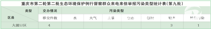 11月27日,重慶市第一生態(tài)環(huán)境保護督察組向大渡口區(qū)交辦第九批群眾信訪舉報件4件,其中來電舉報4件,來信舉報0件。截至11月27日,重慶市第一生態(tài)環(huán)境保護督察組向大渡口區(qū)共交辦信訪舉報件56件(重點交辦件4件),其中來電舉報56件,來信舉報0件。