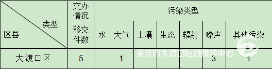 12月1日,重慶市第一生態環境保護督察組向大渡口區交辦第十三批群眾信訪舉報件5件,其中來電舉報5件,來信舉報0件。截至12月1日,重慶市第一生態環境保護督察組向大渡口區共交辦信訪舉報件86件(重點交辦件4件),其中來電舉報86件,來信舉報0件。